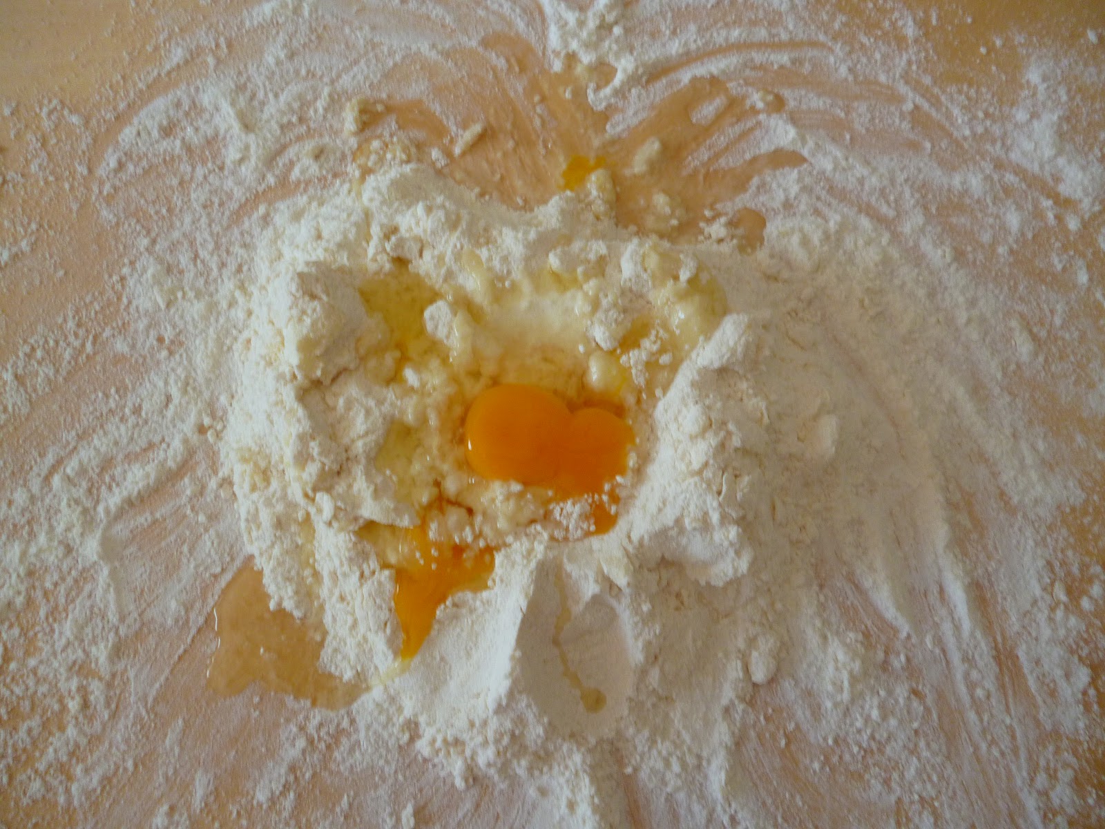 preparare la pasta frolla: su una spianatoia, fare la fontana con la farina e lo zucchero.
